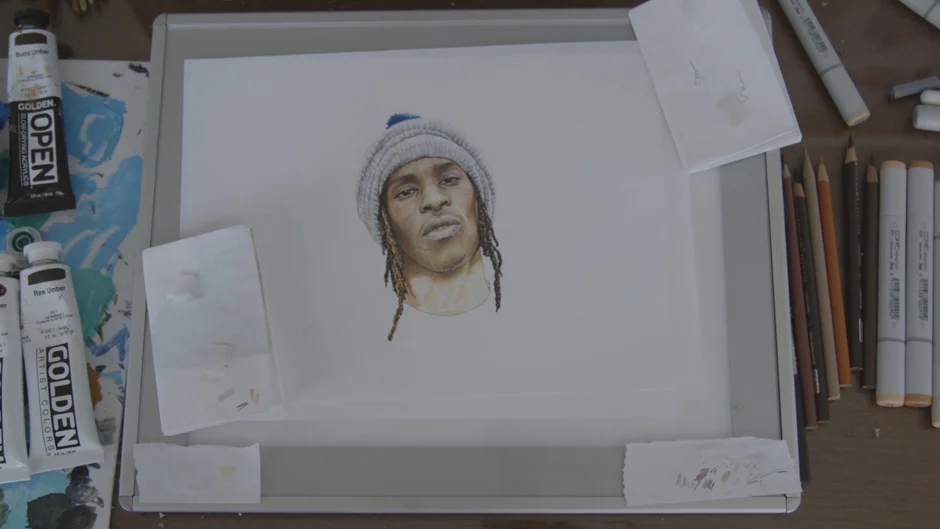 Before Adam Hoens heads to his day job at the Vancouver airport, he wakes up early to sketch and paint his favourite hip hop artists. He goes by @ndlocal on Instagram and his colourful portraits have amassed over 10,000 followers. His paintings of Action Bronson and Childish Gambino have gotten the attention of the artists themselves and with this traction, Hoens has decided to move his art from Instagram to a real-life gallery space. VICE's Sarah Berman stopped by the artists' home to talk about this transition.